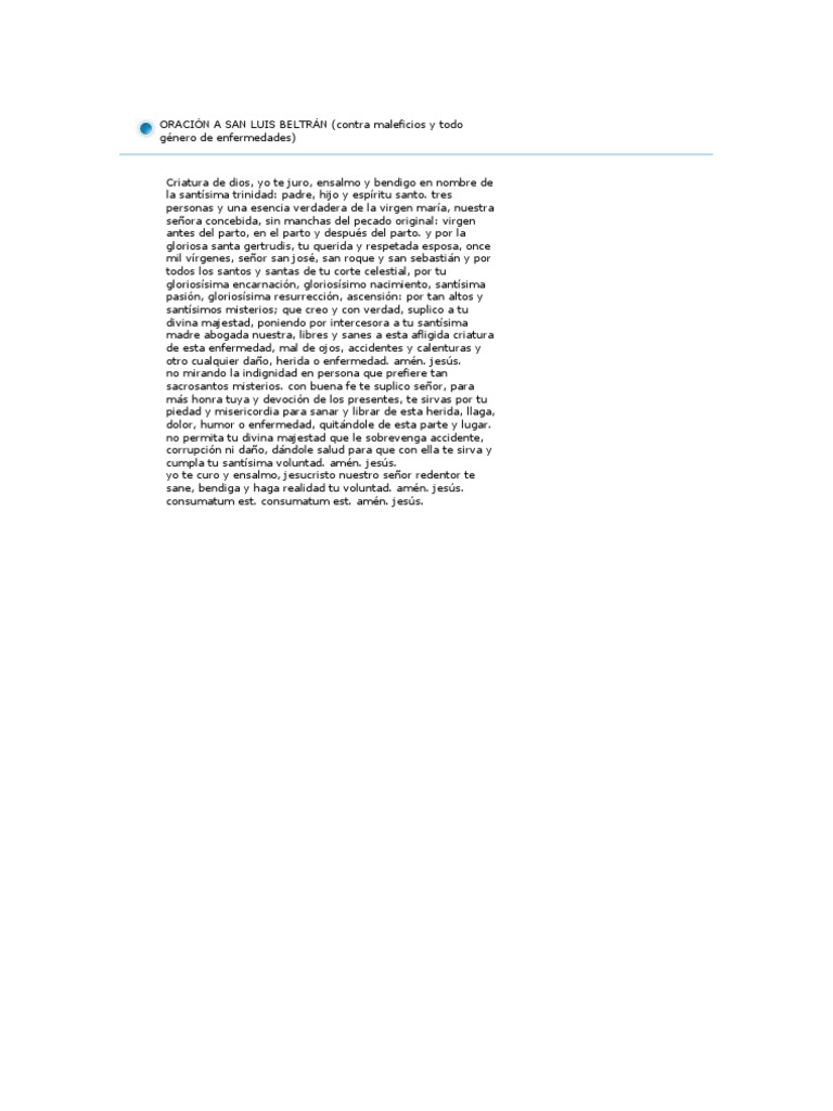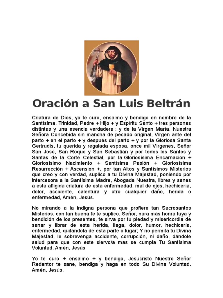 Oracion De San Luis Beltran Para Proteccion Nar Media Kit from imgv2-2-f.scribdassets.com • la humildad religiosa nos hace más dignos del aprendizaje. La gran mayoría de las oraciones a san luis beltrán van dirigidas por personas que necesitan alguna ayuda para ellos o algún ser querido que está pasando por alguna enfermedad. Una oración para pedir la protección de los cuatro arcángeles cuando sales de casa o cuando necesitas rodearte del poder de los cuatro arcángeles. 2 oración a san luis beltrán para el dinero y los negocios. Oración de la sombra de san pedro para protección contra enemigos y y luego se ofrece a san luis beltrán. San luis beltran que cura todo mal. La oración de san luis beltrán es una oración al santo utilizada por los católicos para curar muchas enfermedades, enfermedades, hechizos, hechizos en todos los casos, al leer la oración, se suplica a jesucristo que cure el mal. ¡ oh, señor y redentor nuestro!, yo curo y bendigo a esta afligida criatura, n….